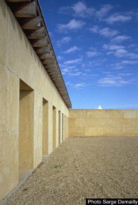 Ce chai, situé à la limite de la Camargue, est réalisé en pierres massives suivant une démarche environnementale. Les blocs de calcaire de coquillier (2,30X1,05X0,52 m) cumulent les rôles de structure, parement extérieur, parement intérieur, isolant thermique et phonique. La toiture végétalisée assure l'isolation thermique. Elle est constituée par une structure en pin d'Orégon sur laquelle sont posés des bacs acier, étanchés et recouverts de terre végétale.
