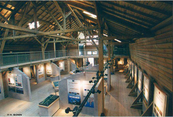 Cet ancien hangar de stockage du sel a été entièrement démonté puis reconstruit à l'identique pour abriter un écomusée. l'utilisation maximum du bois brut a permis de conserver l'esprit originel du bâtiment. Il constitue un témoignage du savoir faire des artisans et mets en évidence les qualité architecturale de ce type de bâtiment : volumétrie simple, toiture à deux pentes, ton bitubineux du bardage ajouré par endroits pour la ventilation.